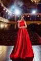 Sale Satin Red Evening Dresses Jewel Neck Beading Straps A Line Prom Dress Ruffles Floor Length Formal Party Gowns Robe De Soiree